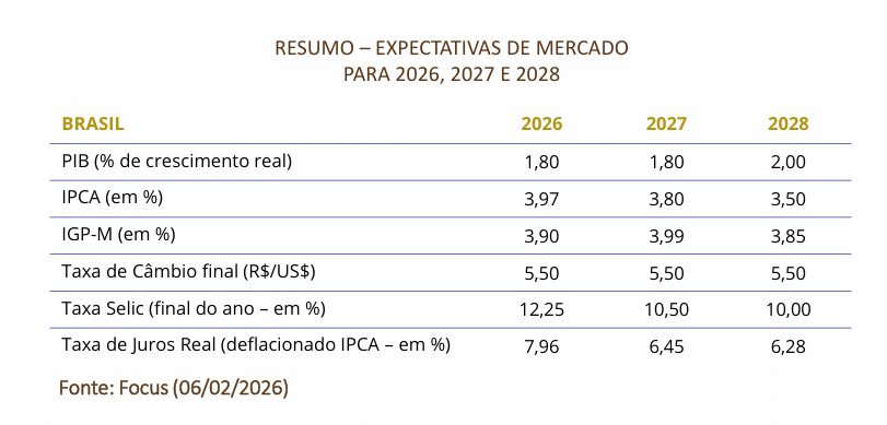 No Brasil, o fim de 2025 foi marcado por desaceleração da atividade, apesar do mercado de trabalho ainda robusto. Já no início de 2026, a inflação registrou um aumento de 0,33% em janeiro e o Copom manteve a Selic em 15% a.a.. No exterior, os Estados Unidos mostraram desaceleração do emprego com atividade resiliente, enquanto a zona do euro seguiu com crescimento moderado. Já a China manteve expansão sustentada pelo setor externo.