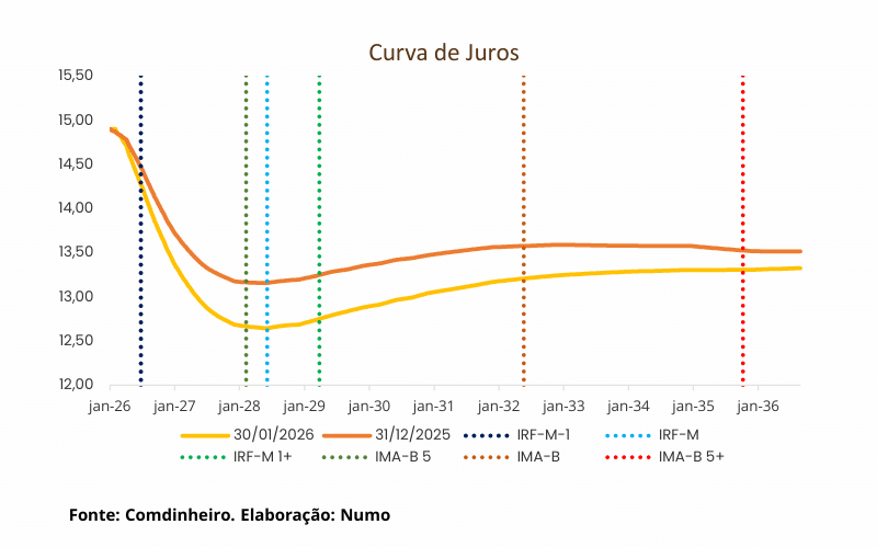 Os próximos movimentos da curva de juros permanecerão condicionados à evolução da inflação e à condução das políticas fiscal e monetária. Além dos fatores domésticos, que ganham relevância adicional em um contexto pré-eleitoral, elementos externos também exercem influência significativa sobre os ativos, como as oscilações do dólar e dos rendimentos dos títulos do Tesouro norte-americano, que impactam a precificação dos ativos brasileiros.