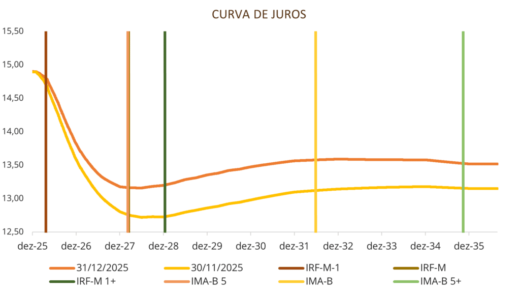 O comportamento dos índices refletiu o movimento de abertura da curva de juros observado no período. Neste contexto, os segmentos mais longos da curva sofreram maior pressão, em especial os índices IMA B 5+ e IRF-M 1+, que apresentaram retornos negativos no mês, refletindo a maior sensibilidade desses ativos às variações do cenário.