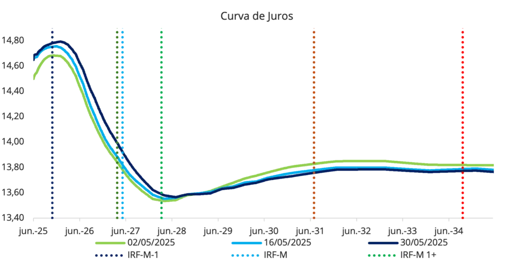 Durante o mês de maio de 2025, observamos uma elevação moderada na parte curta e intermediária da curva de juros. As taxas nos vértices de curto prazo se mantiveram pressionadas, refletindo o ambiente de juros elevados e a postura cautelosa do Banco Central frente ao cenário inflacionário persistente. A taxa Selic foi mantida em 14,75% ao ano, e essa política tem ancorado as taxas curtas.