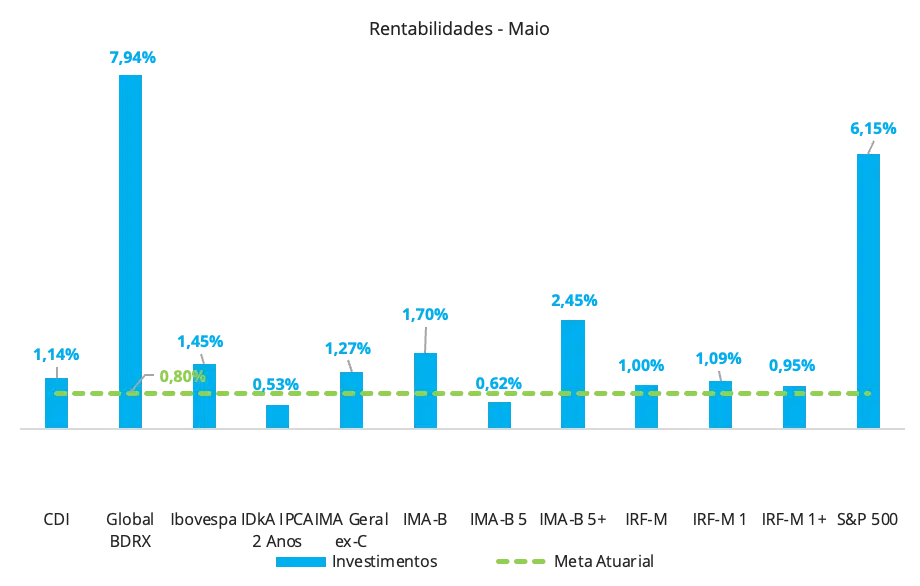 Em maio, uma trégua na guerra comercial entre Estados Unidos e China reforçou o apetite por ativos de risco no exterior. Se mantém as preocupações acerca do crescimento econômico da Europa, enquanto a China segue com deflação e cortando juros para impulsionar a economia. No Brasil, o desempenho econômico surpreendeu positivamente, impulsionado por setores estruturais e melhora no mercado de trabalho.