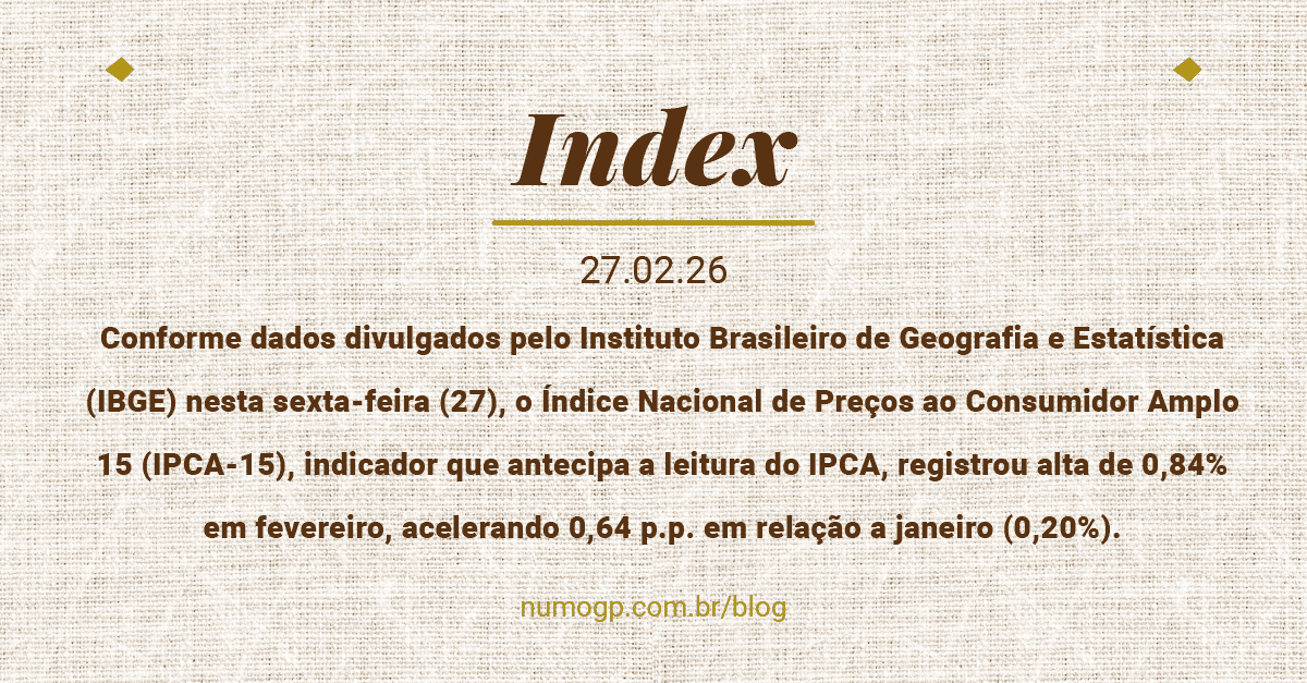 Conforme dados divulgados pelo Instituto Brasileiro de Geografia e Estatística (IBGE) nesta sexta-feira (27), o Índice Nacional de Preços ao Consumidor Amplo 15 (IPCA-15), indicador que antecipa a leitura do IPCA, registrou alta de 0,84% em fevereiro, acelerando 0,64 p.p. em relação a janeiro (0,20%). No acumulado do ano, o índice soma 1,04% e, em 12 meses, 4,10%, abaixo dos 4,50% observados nos 12 meses imediatamente anteriores. Em fevereiro de 2025, a variação havia sido de 1,23%.