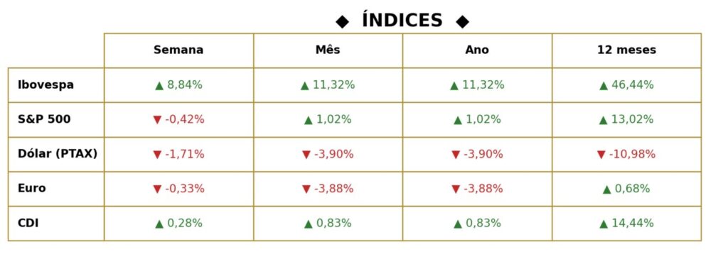 Ibovespa renova recorde e fecha acima de 175 mil pontos – O Ibovespa fechou a quinta-feira (22) em 175.589 pontos, com alta de 2,2%, após tocar aproximadamente 178 mil pontos no melhor momento do pregão. O volume financeiro somou R$ 44,1 bilhões. Em janeiro, até o dia 20, o saldo de capital estrangeiro na B3 foi positivo em R$ 8,8 bilhões. No acumulado, o índice registrou alta de 6,55% na semana e cerca de 9% no ano. Entre os destaques, ações de bancos avançaram, com Banco do Brasil (+4,69%), Itaú (+3,38%), Bradesco (+2,73%) e Santander (+1,68%). Em commodities, Vale (+0,58%) e Petrobras subiu, com PETR3 (+0,69%) e PETR4 (+0,45%).